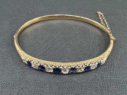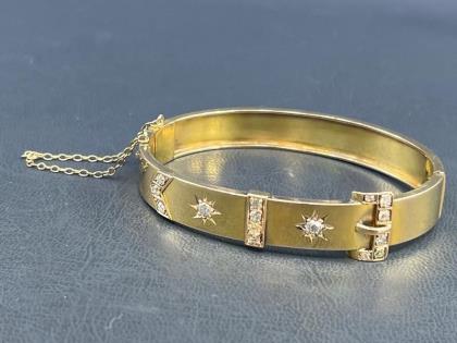 15CT GOLD & DIAMOND SET BUCKLE STYLE HINGED BANGLE WITH 15 DIAMONDS INCLUDING 2 STAR SET - 18.6GM - 6.9CM DIAMETER