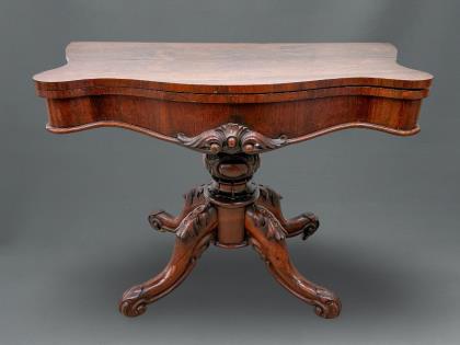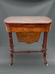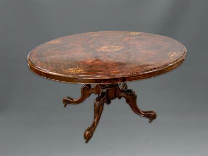 VICTORIAN BURR WALNUT INLAID OVAL TILT TOP PEDESTAL TABLE RAISED ON QUADRAFORM BASE - 73CM (H) X 147.5CM (W) X 112.5CM (D)