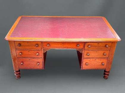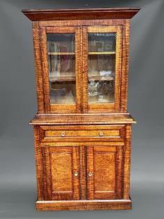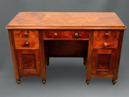 BIRDSEYE HUON PINE 5 DRAWER 2 DOOR LADIES DESK RAISED ON TURNED LEGS - 73.5CM (H) X 121CM (W) X 51.5CM (D)