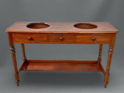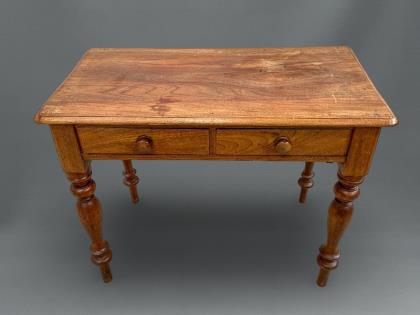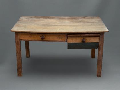 HUON PINE 2 DRAWER KITCHEN TABLE RAISED ON SQUARE LEGS - INCLUDES FLOUR BIN DRAWER & PULL OUT BOARD - 77CM (H) X 137CM (W) X 82.5CM (D)