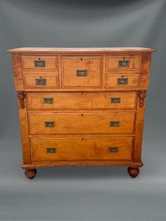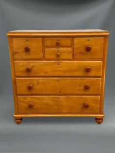 BIRDSEYE HUON PINE 7 DRAWER CHEST OF DRAWERS RAISED ON TURNED LEGS - 121.5CM (H) X 119.5CM (W) X 58.5CM (D)