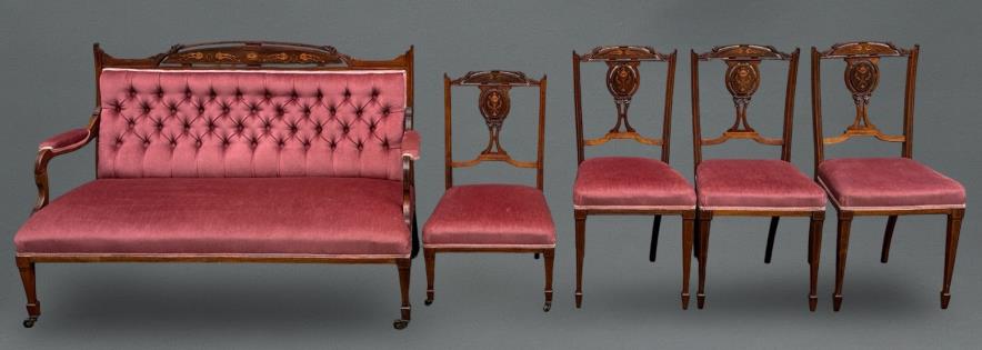 19TH CENTURY INLAID ROSEWOOD DRAWING ROOM PART SUITE INCL 3 MATCHING DINING CHAIRS - 86.8CM (H) SETTEE RAISED ON CASTERS - 87.5CM (H) X 132CM (W) & SITTING CHAIR RAISED ON CASTERS - 76CM (H) - SOME REPAIRS TO ARMS & BACKS