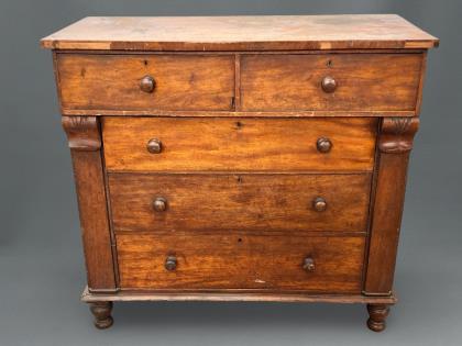 19TH CENTURY CEDAR & HUON PINE 5 DRAWER CANTILEVER CHEST OF DRAWERS RAISED ON TURNED LEGS FLANKED BY CORBELS & FLAT PILASTERS - 128CM (H) X 133CM (W) X 61.5CM (D)