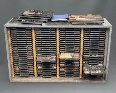 100 DRAWER PRINTMAKERS CABINET & LARGE QTY OF PRINTING BLOCKS LETTERS PLATES SPACERS ETC - PRINTING BLOCK SUBJECTS INCL HOBART RELATED MOTORING BP SHELL AMPOL MOBIL AIRLINES MILITARY & MORE - CABINET 91.5CM (H) X 151.5CM (W) X 50CM (D)