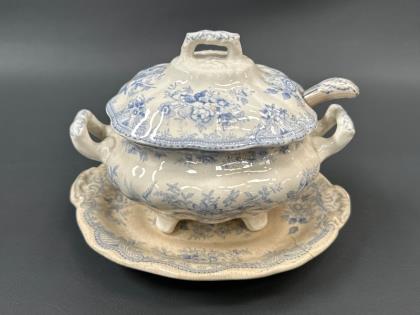 19TH CENTURY ASIATIC PHEASANTS SMALL TUREEN & LADLE - 15CM (H) & PLATE - PLATE CRACKED - 21.5CM (W)