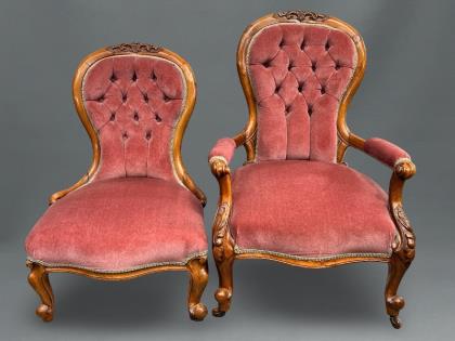 PAIR OF 19TH CENTURY WALNUT LADIES & GENTLEMEN'S CHAIRS - 82CM (H) X 59CM (W) X 77CM (D) & 93CM (H) X 68CM (W X 85CM (D)