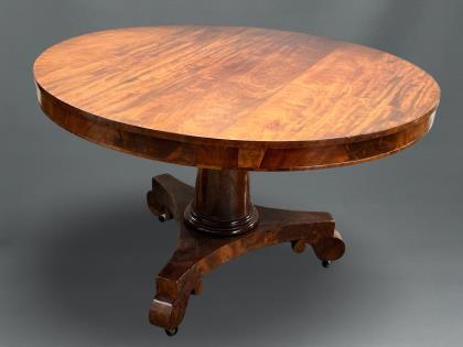19TH CENTURY MAHOGANY ROUND TOP PEDESTAL DINING TABLE RAISED ON TRIFORM BASE & CASTERS - 78.5CM (H) X 122CM DIAMETER